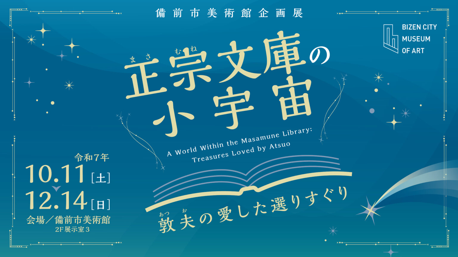 正宗文庫の小宇宙 敦夫の愛した選りすぐり <会場>備前市美術館 2階 展示室3<会期>2025年10月11日(土)~12月14日(日)<開館時間>9:00~17:00(最終入場16:30)※毎週月曜休館(祝日の場合は開館、翌日休館)<チケット料金>大人 500円学生 300円中学生以下 無料65歳以…