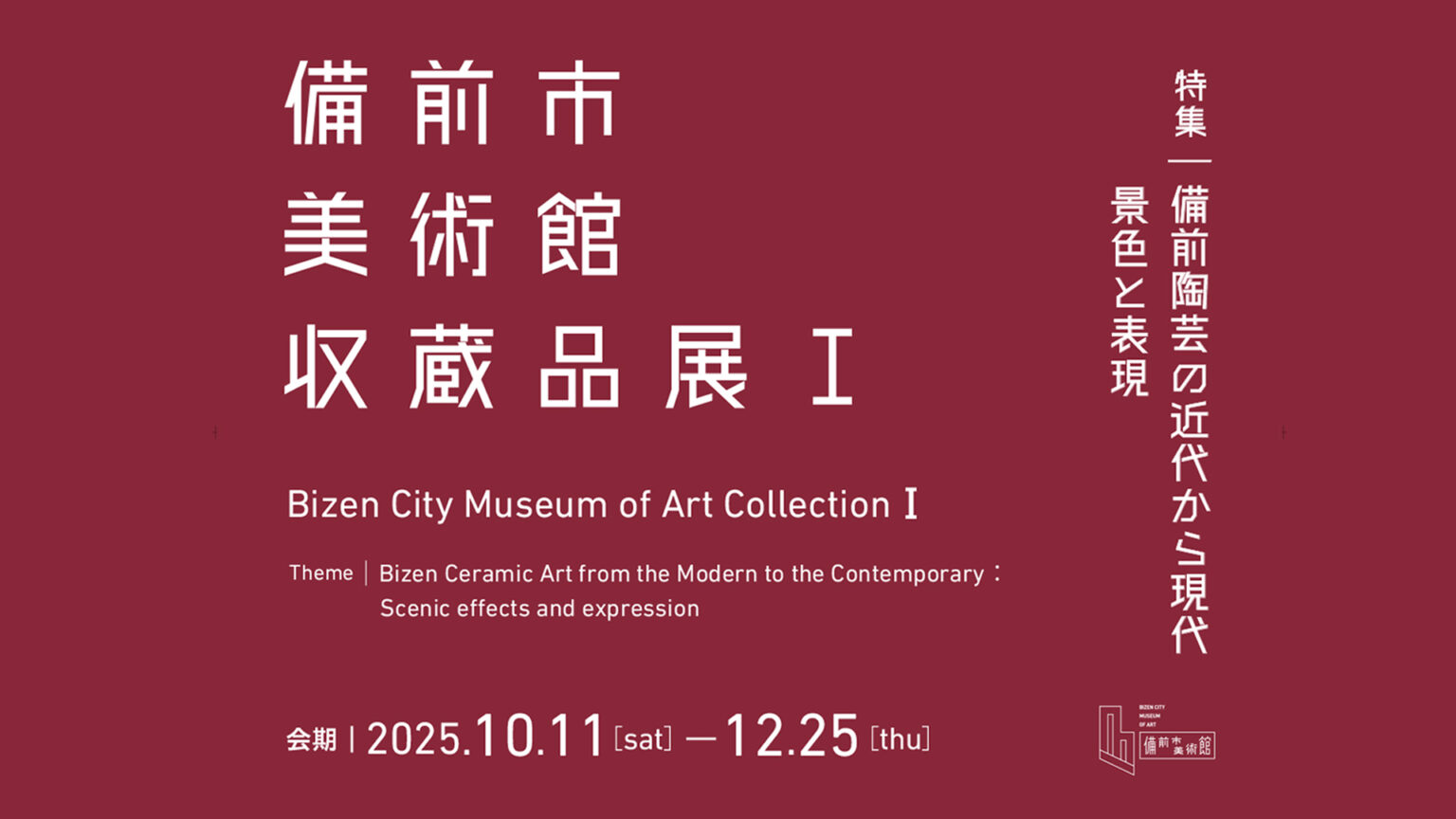 備前市美術館 収蔵品展Ⅰ─特集:備前陶芸の近代から現代 景色と表現 <会期>2025年10月11日(土)~12月25日(木)、2026年1月6日(火)~3月8日(日)※毎週月曜休館(祝日の場合は開館、翌日休館)<会場>備前市美術館2F展示室2 ※2026年1月6日からは1F展示室0<開館時間>9:0…