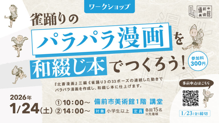 『北斎漫画』三編《雀踊り》は33ポーズが描かれています。このワークショップでは《雀踊り》の連続した動きを活かしてパラパラ漫画を作成し、和綴じ本に仕上げます。◆日時:2026年1月24日(土)(1)10:00~ (2)14:00~◆対象:小学生以上◆会場:備前市美術館1階 講堂◆定員:各回15名 ※先…