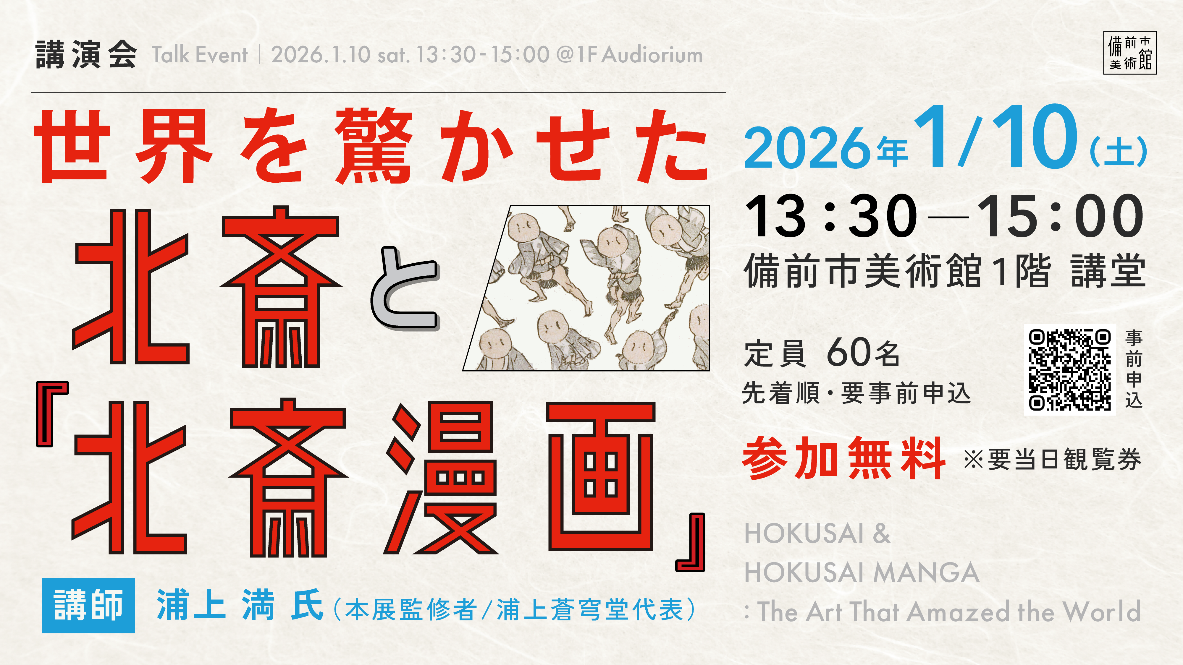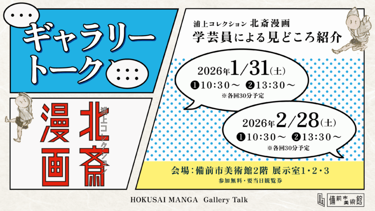 備前市美術館開館記念特別展 「浦上コレクション 北斎漫画 画狂!画驚!!画叫!!!」 開催概要 <会期>2026年1月10日(土)〜 2026年3月8日 (日)<会場>備前市美術館2階 展示室1〜3<チケット料金>一般 1,000(900)円 65歳以上(備前市・赤穂市・上郡町在住者) 750(70…