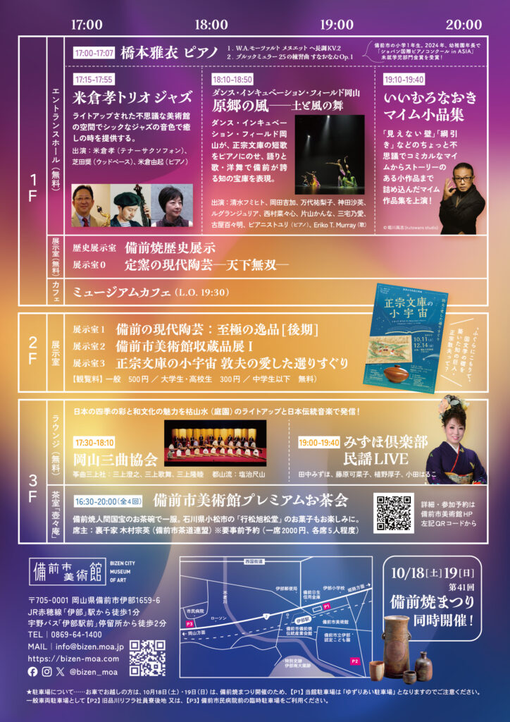 ■駐車場について:お車でお越しの方は、10月18日(土)・19日(日)は、備前焼まつり開催のため、【P1】当館駐車場は「ゆずりあい駐車場」となりますのでご注意ください。 一般車両駐車場として【P2】旧品川リフラ社員寮後地 又は、【P3】備前市民病院前の臨時駐車場をご利用ください。→駐車場MAP