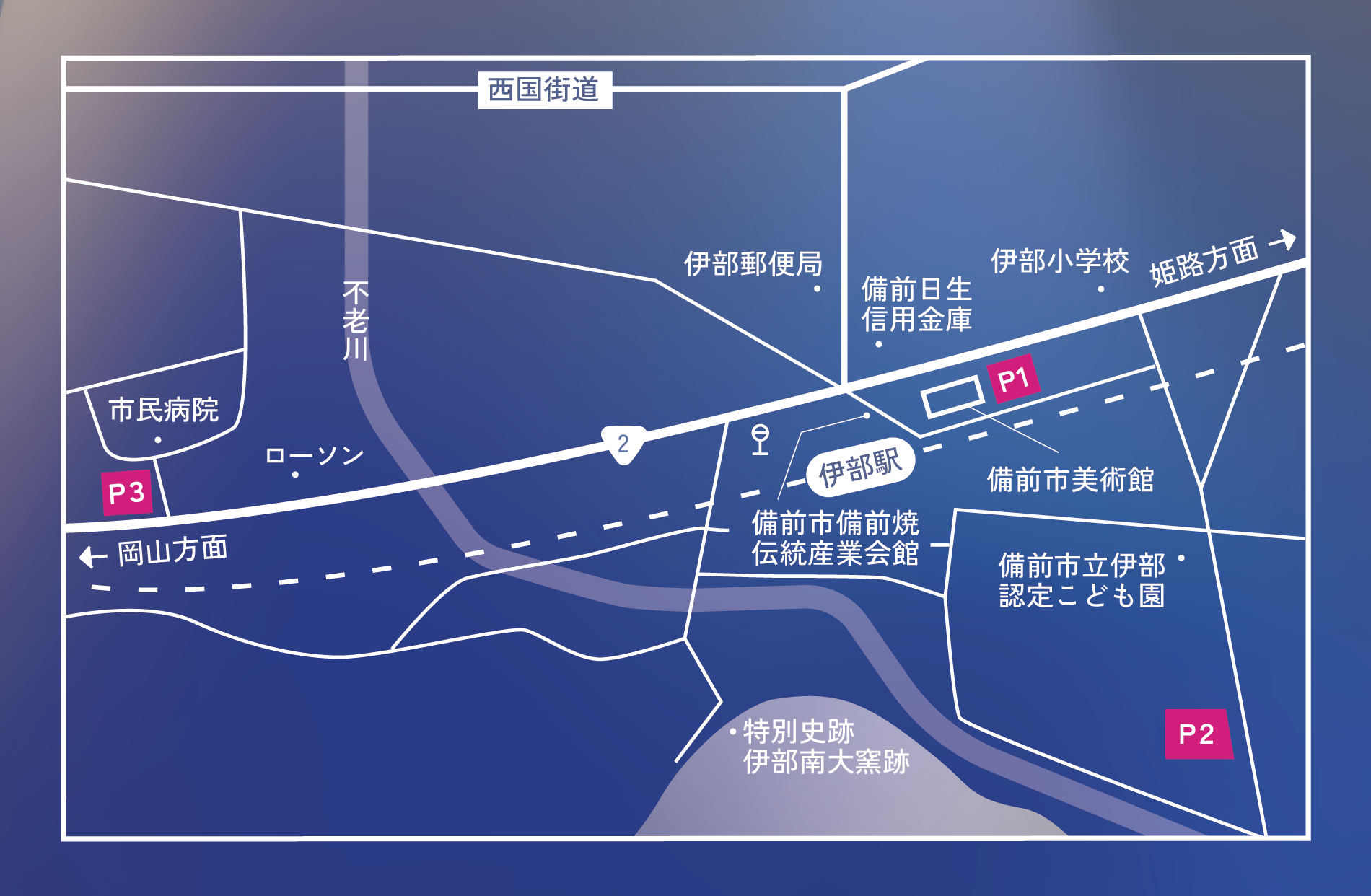 ■駐車場について:お車でお越しの方は、10月18日(土)・19日(日)は、備前焼まつり開催のため、【P1】当館駐車場は「ゆずりあい駐車場」となりますのでご注意ください。 一般車両駐車場として【P2】旧品川リフラ社員寮後地 又は、【P3】備前市民病院前の臨時駐車場をご利用ください。→駐車場MAP