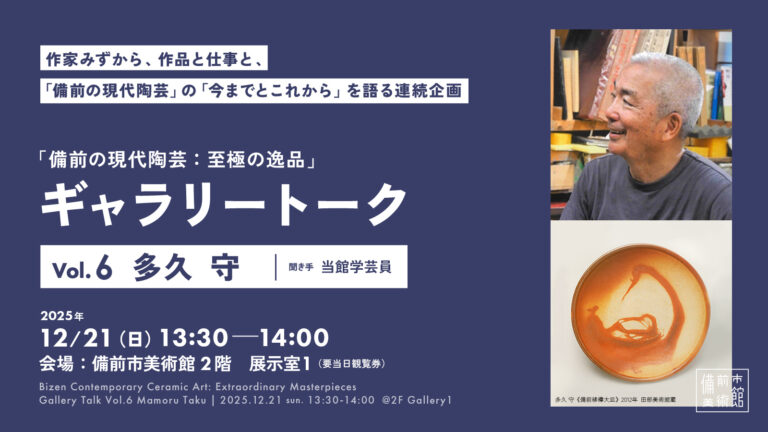 ギャラリートークでは、出品作家が担当学芸員と会話形式で、自らの作品や、経歴、仕事、そして「備前の現代陶芸」の「今までとこれから」についてお話しします。
