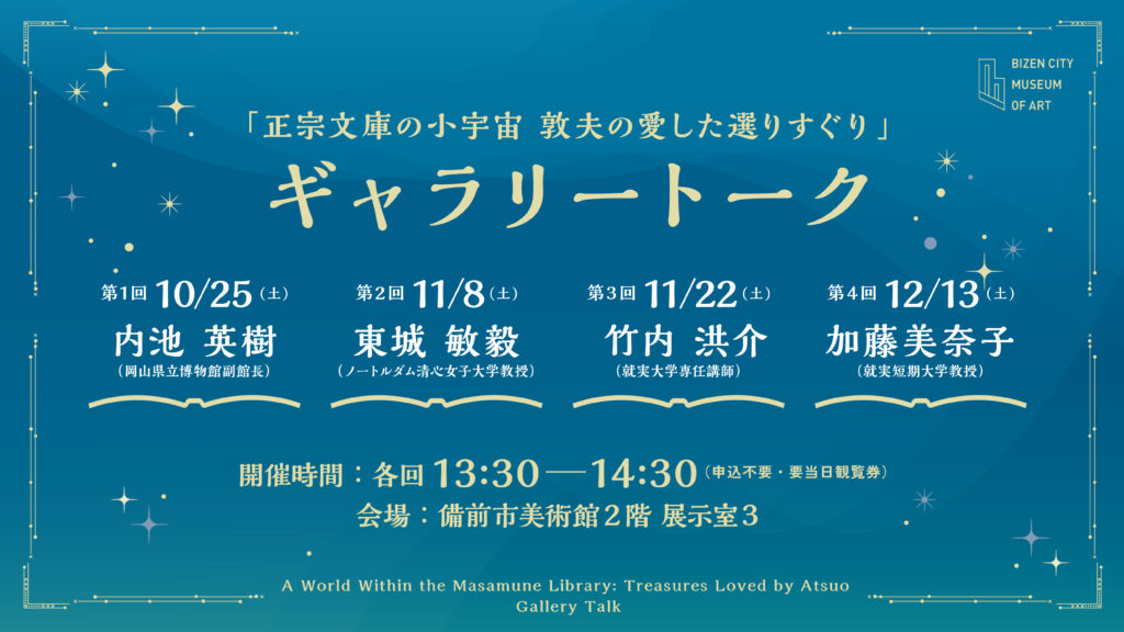 10/14(土)〜12/11(日)備前市美術館で開催中の企画展「正宗文庫の小宇宙 敦夫の愛した選りすぐり」にあわせて、正宗敦夫と彼が生涯を通して蒐集した貴重資料を抱える「正宗文庫」についてギャラリートークを開催します。申込不要でどなたでもお気軽にご参加いただけます。ぜひこの機会にご参加くださいませ。