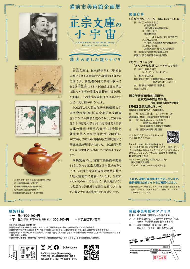本展では、備前市美術館の開館とともに改めて正宗文庫と正宗敦夫を取り上げ、これまでの研究成果を地元備前市でも発表いたします。当市のかけがえのない文化として、敦夫選りすぐりの名品たちが形成する正宗文庫の小宇宙をご覧いただける機会となれば幸いです。