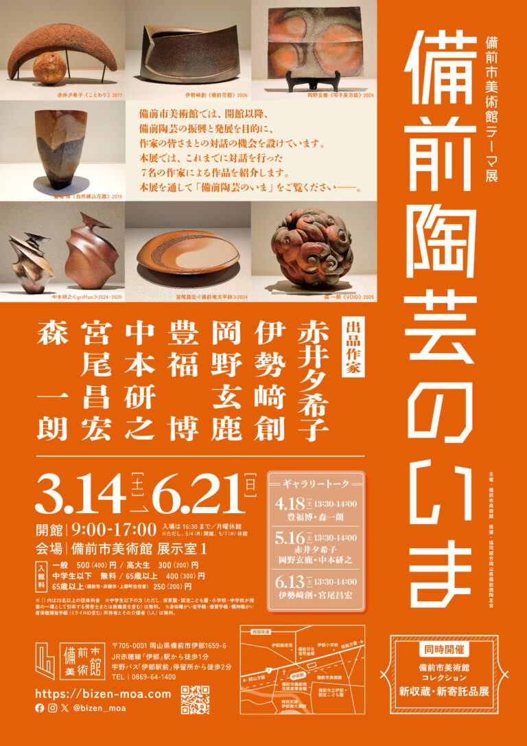 館は今後も、備前の多彩な作家の皆さまと交流を重ねながら、備前の現代陶芸を担う新たな表現の作品を継続的に発信してまいります。本展を通して「備前陶芸の今」をご覧いただければ幸いです。