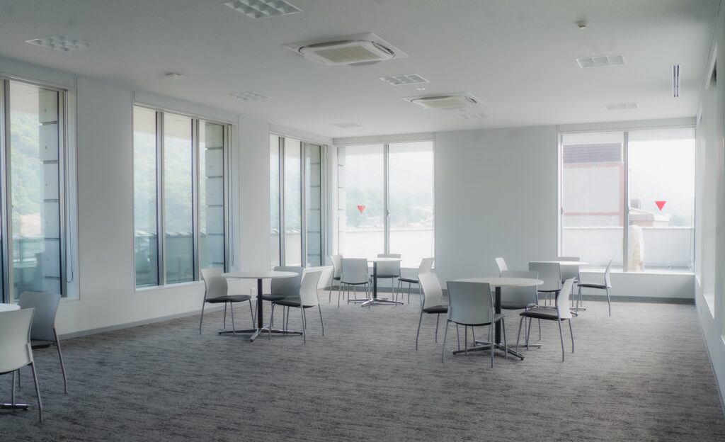 誰もが自由に過ごせる居場所。鑑賞後の休憩や、ちょっとしたイベントにご利用いただけます。窓からは国史跡南大窯跡を臨むことができます。