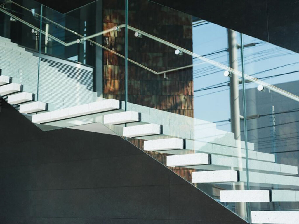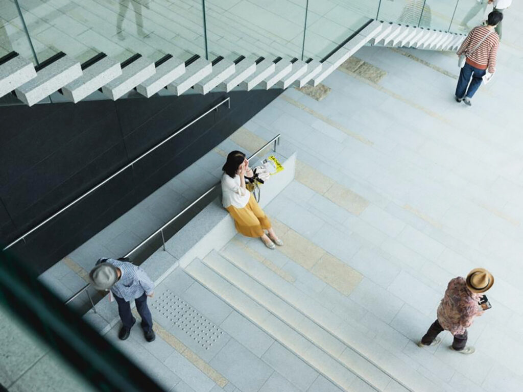 作品の美しさが際立つモノトーンを基調とし、階段や床材には瀬戸内の自然が育んだ自然石を使用しました。どれも美術館の設計者である、建築家・櫻井潔さんが自ら産地に足を運び選んだものです。