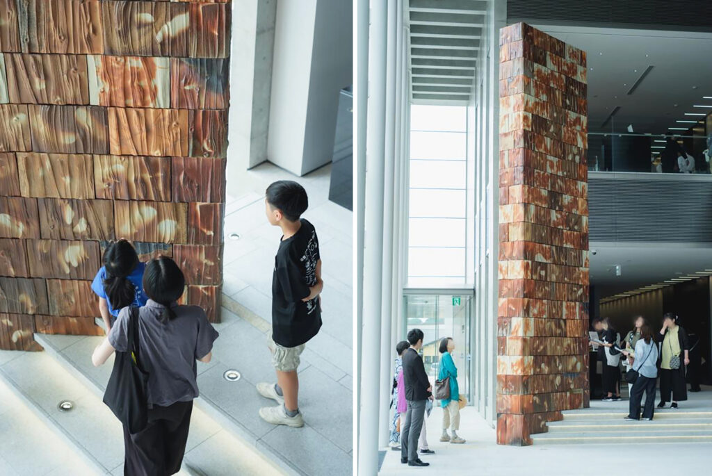エントランス中央には、人間国宝・伊勢﨑淳さんによる備前焼のモニュメント。近くで見ると、一枚一枚が、備前焼の焼成に使う松のような意匠になっていることに気づくはず。