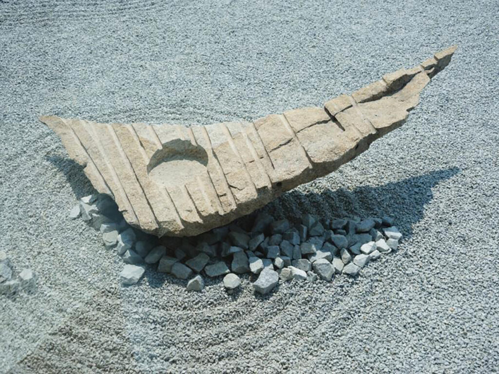 茶室に隣接する屋上庭園に並ぶ景石は、瀬戸内海で採れた自然石(庵治石、与島石、白石島みかげ)から作られたもの。