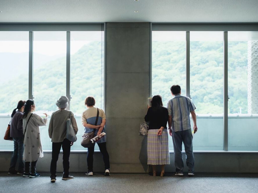 美術館に一歩足を踏み入れると、窓から明るい光が差し込む開放的なエントランスが広がります。備前焼の里・伊部のまちの賑わいと接しながらも、凛とした静けさが漂い、作品とゆっくり向き合うゆたかな時間を予感させます。