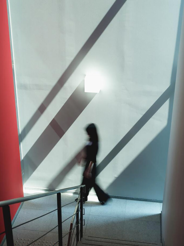 隠れたフォトスポット・階段室。スリットから差し込む光が美しく、見学会では時間をかけてじっくりと撮影する方を何人も見かけました。見上げると天井にもちょっとしたこだわりが。