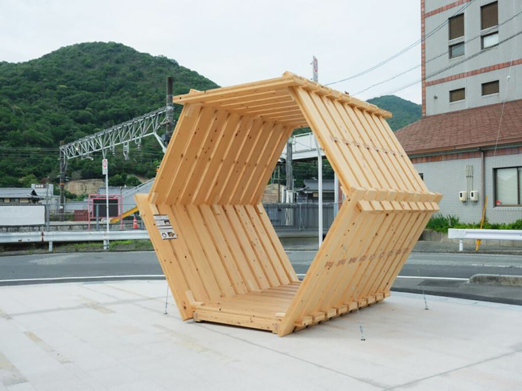 美術館の前には大きな六角形のオブジェも。これは岡山県産ヒノキCLTで制作されたもの。六角形は「亀甲模様」と呼ばれるように縁起が良いかたちの一つです。それを連続させることで永遠に続く繁栄を表現しています。天皇皇后両陛下のご臨席を仰ぎ開催した第74回全国植樹祭(2024年)の式典で発表されたものを、後世に引き継ぐレガシー(遺産)として美術館に移設しました。(制作:株式会社佐田建美)